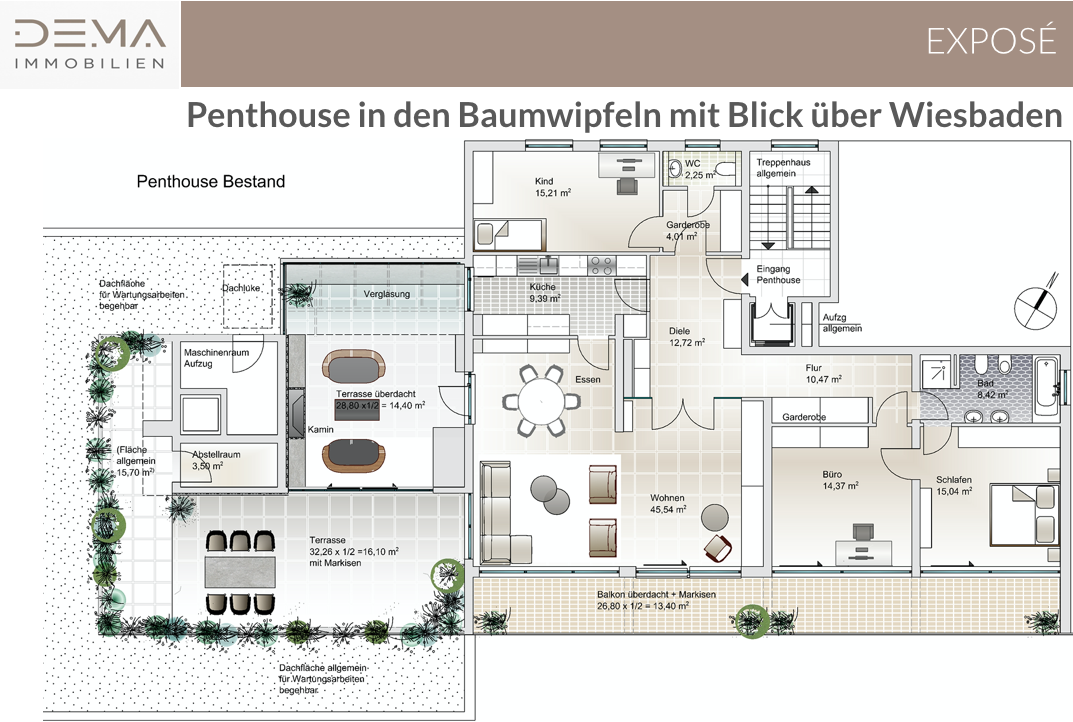 Die beeindruckende Dachterrasse ist das Herzstück dieser Wohnung. Sie bietet dank ihrer Lage absolute Privatsphäre, herrliche Fernblicke und vielfältige Nutzungsmöglichkeiten – ob als Ort zum Entspannen, zum Grillen oder für gesellige Abende. Eine neuwertige elektrische Sonnenmarkise, umlaufende Bepflanzung und eine fest installierte Bewässerungsanlage sorgen für Komfort und Pflegeleichtigkeit.